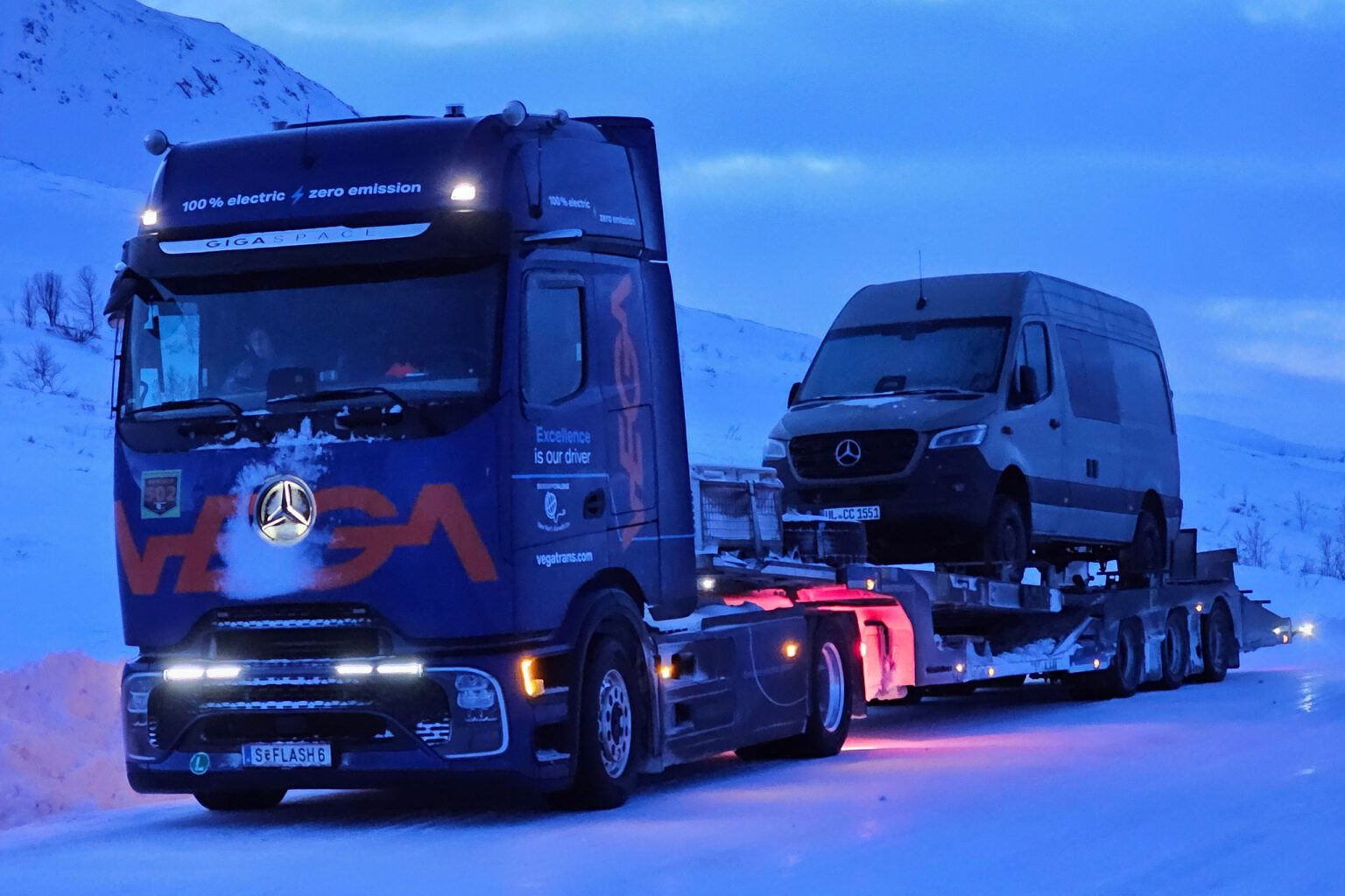 True to real-world conditions, the eActros 600 wasn’t running light. It hauled a transport semi-trailer carrying a Mercedes-Benz Sprinter, bringing the combined gross vehicle weight to 32.5 tonnes, the same configuration VEGA uses in daily operations. Impressively, Mercedes-Benz Trucks confirmed the eActros 600 remained almost entirely stock throughout the challenge, with the only change being specialised tyres to handle extreme winter conditions.